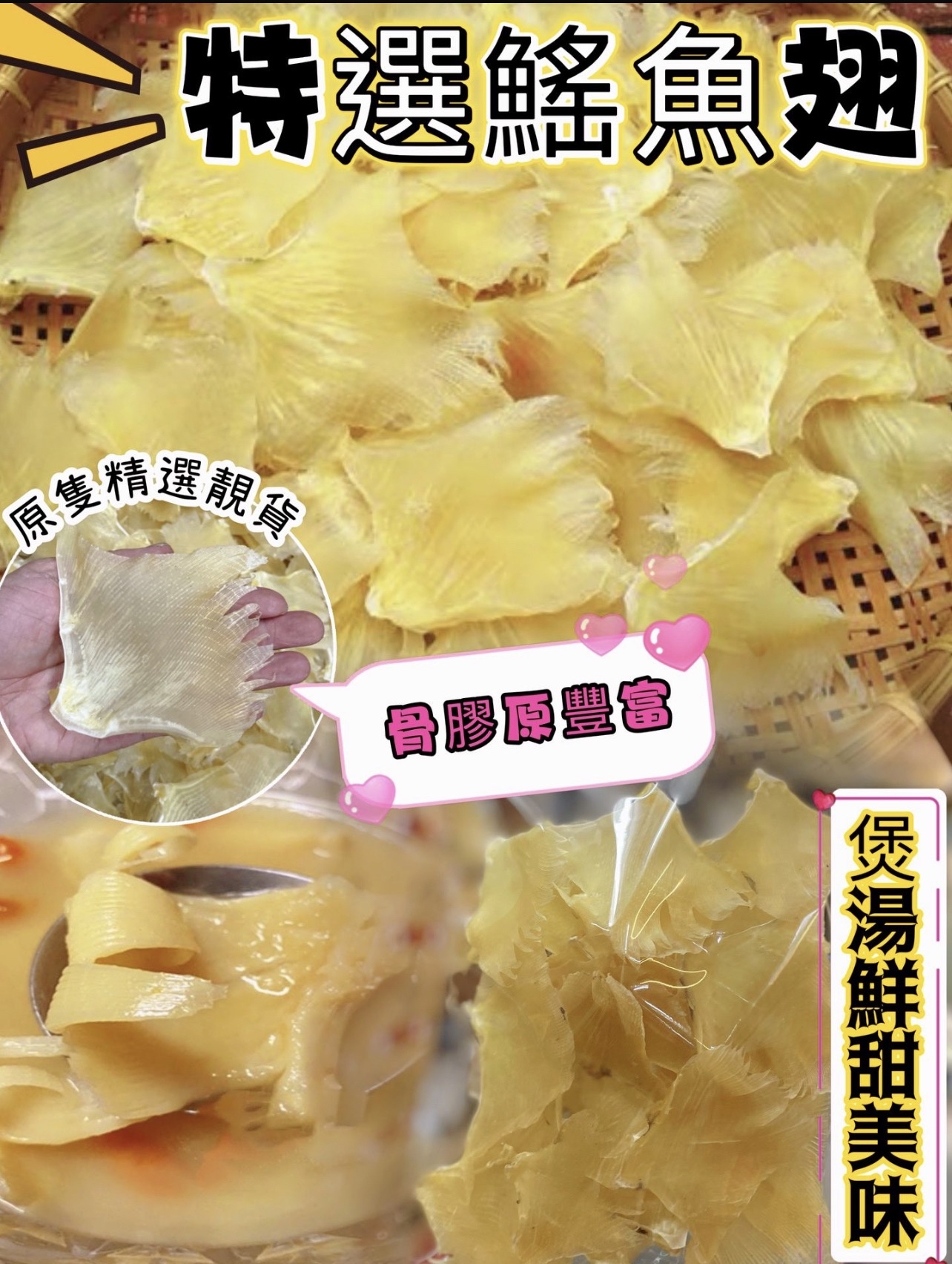 鰩魚翅並非傳統嘅鯊魚鳍,而是鰩魚的背鰭和腹鰭 。 💮含鈣質及鐵質有助強化骨骼💮 預防骨質疏鬆🉐 膠元蛋白及久軟骨素🉐 可防止皮膚衰老🉐 軟骨磨損骨骼退化🉐 平民❤️鮮甜💜美味🧡補骨首選👑 而鰩魚翅的食用方法最好是煲湯🍲,在煲湯過程中,鰩魚翅會慢慢融化。令湯中帶有鮮甜🤩味,而且煲過湯之後的鰩魚翅,口感像吃元貝那樣,帶濃濃的鮮甜海味。 💁🏻♀️鰩魚翅樹菇湯 材料有 : 鰩魚翅、蓮子、百合、茶樹菇、雪耳、淮山、蜜棗、豬展同紅蘿蔔 💁🏻功效係 : 對胃寒、胃炎同水腫有幫助、養肝旺血、補充軟骨膠質、養顏健脾胃、鞏固鈣質、預防骨質疏鬆及幫助兒童骨骼成長 🅰️📦規格:150克/包▶️+−5克◀️(約12-17隻) 🅱️📦規格:454克/包▶️+−8克◀️(約35-45隻) 📆食用期限:2026年 08月28日 🗄儲存方法:請存放於雪櫃 💁🏻♀️溫馨提示:海產表面上略呈白點或粉狀是(鹽霜)屬正常現象請放心食用 📦 門市自取暫停,可預約交收 滿$300可享免費順豐門市或智能櫃送貨 💥請注意體積較大貨品未能放入智能櫃,例如:滑板車、嬰兒車、單車…. (其他偏遠地區需另付附加費) 預約交收可WhatsApp 69388829 🌟店內貨品的貨期一般為2-5星期,如急單可先email 或WhatsApp 確認所需產品貨期。因不能準確預算運輸及清關時間,請預鬆貨期。由於貨物種類太多, 批發及零售同步,庫存或未能及時更新。如付款後現貨售罄,貨期將自動延長至下一批新貨期,恕不接受貨期延誤原因取消訂單退款,下單前敬請諒解。(廠家或供貨商缺貨除外) 🌟 以上帖文內容及外盒包裝只供參考用途,商品原廠隨時有更換新包裝權利, 圖片只供參考,一切以實物為準。 🌟 人手量度尺寸有機會有1至3cm誤差實屬正常。 🌟貨品在運輸途中導致產品包裝外盒有任何損毀凹陷,但不影響其產品本身食用/使用,本司不會作任何更換或退款,介意慎購!如需送禮,建議選擇另加外包裝。 🌟退換貨安排:非人為損壞,質量問題7天內有壞包換,運費需由客人支付。